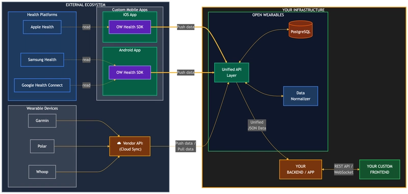 The third option is what led us to build Open Wearables. It's an open-source platform that normalizes data from Garmin, Apple Health, Whoop, Polar, and Suunto into a single REST API. Self-hosted via Docker, MIT-licensed, and designed so that a team can go from zero to pulling unified wearable data in minutes rather than months.