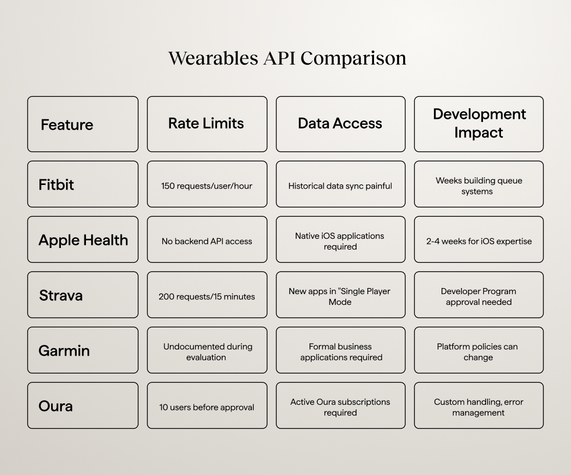 Apple Health requires a native iOS app since no backend API exists. You literally cannot access the data any other way. Garmin demands formal partnership applications with 2-week approval cycles. Fitbit limits developers to 150 requests per user per hour. Each platform uses different OAuth flows, data formats, and rate limits.
