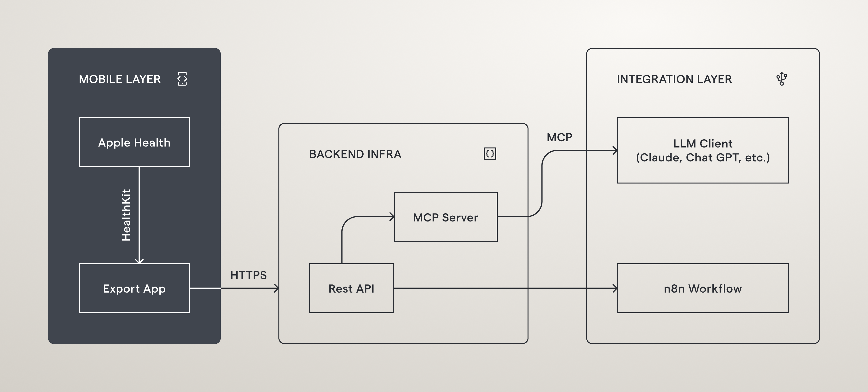 The goal was simple: solve the two problems above. My personal ambition was to “free” my data from Apple Health, make it available through an API, and then expose it to LLMs (like Claude) via an MCP server. The stretch goal was to add automation that would, for example, send a weekly summary comparing the results to the previous week.