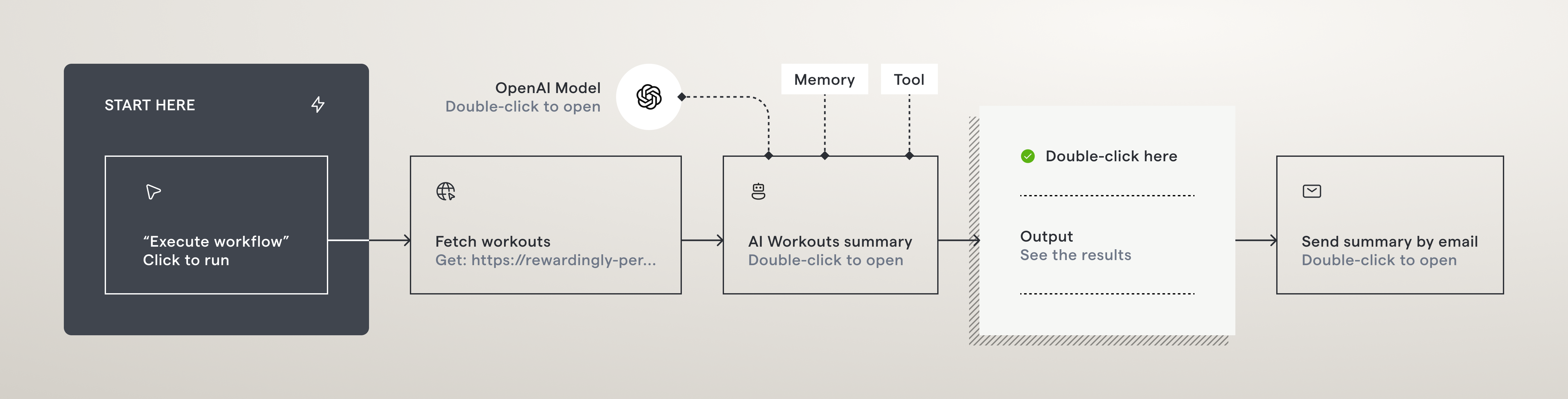 - HTTP request node: it requested our backend to fetch workout data. We used query params to filter workouts only from the latest month.